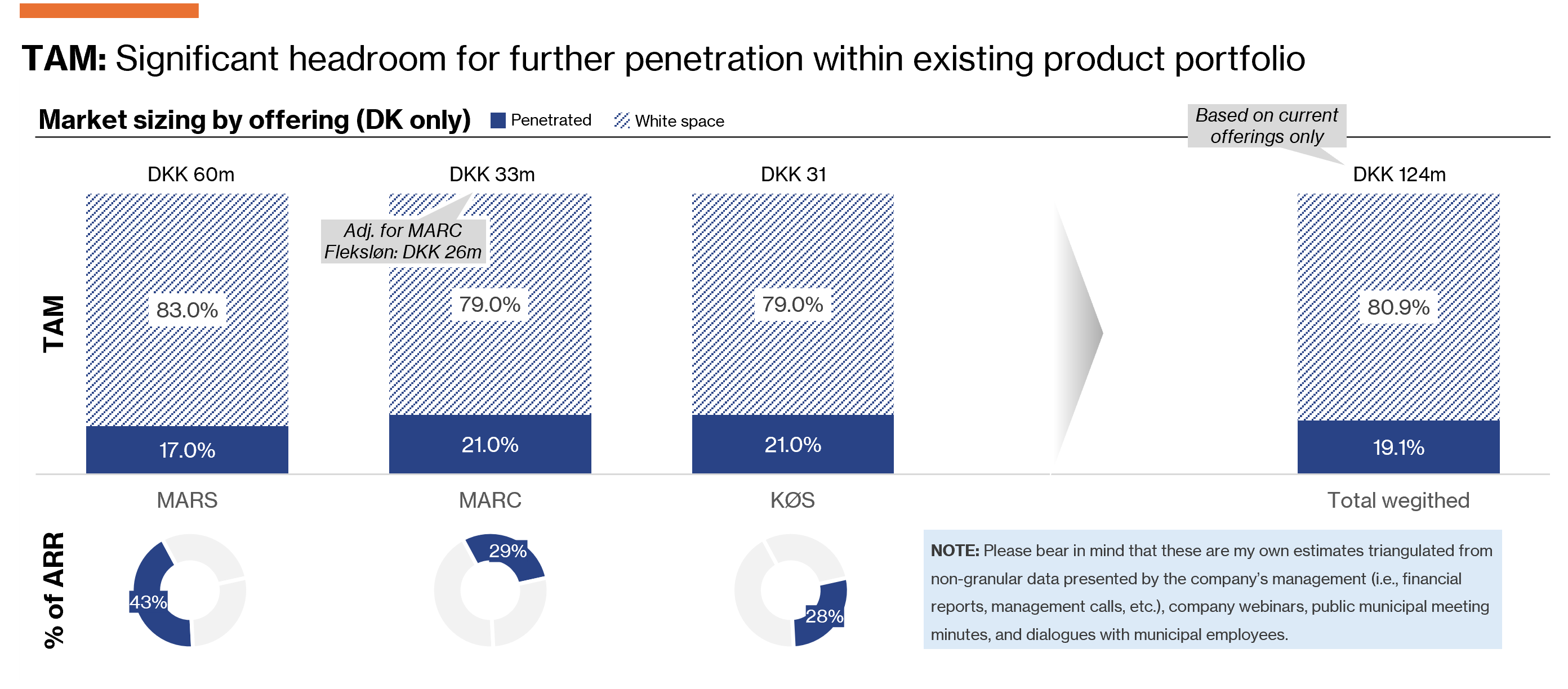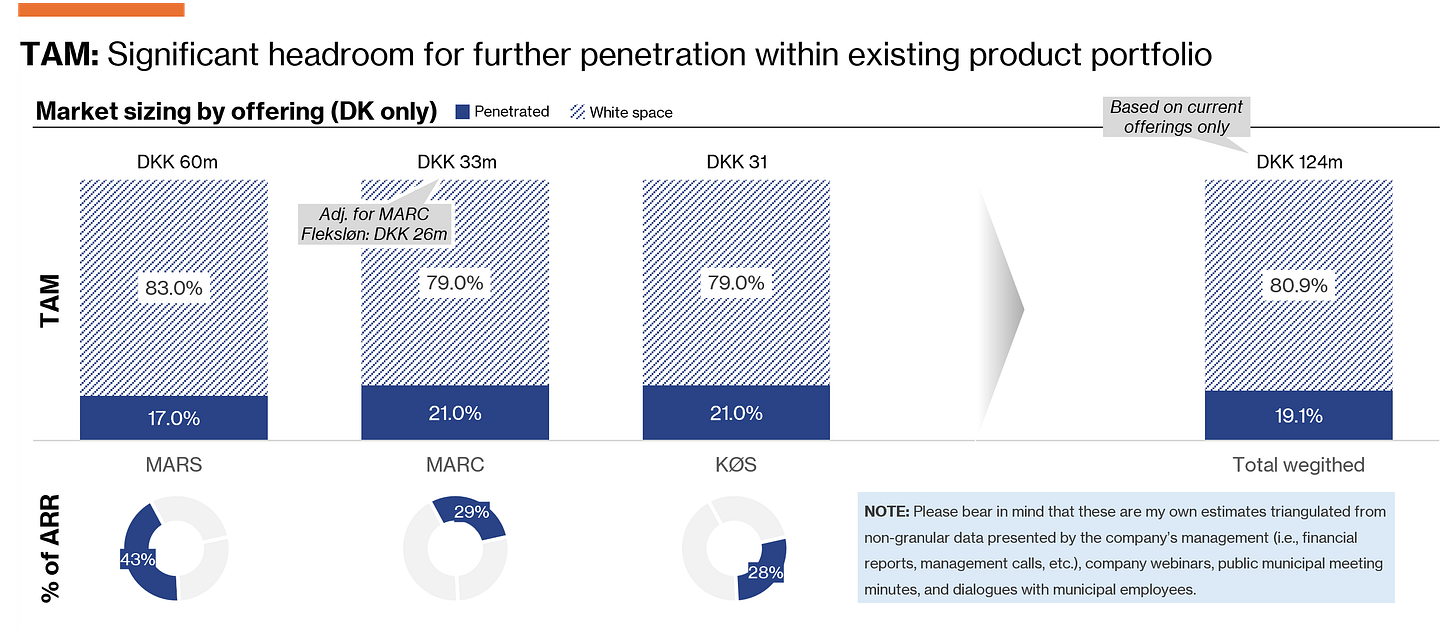 Customers are billed on a module basis (i.e. each platform comes with x number of modules for which the municipality can (de)select according to their needs). In that context, a sales split across modules vis-á-vis platforms is perhaps more important — and while management is tight-lipped on this matter, they have added a bit of nuance. Its MARC Fleksløn module, which is currently facing competition from KOMBIT (more on this in the next section), accounts for a big chunk (~19%) of total AAR.