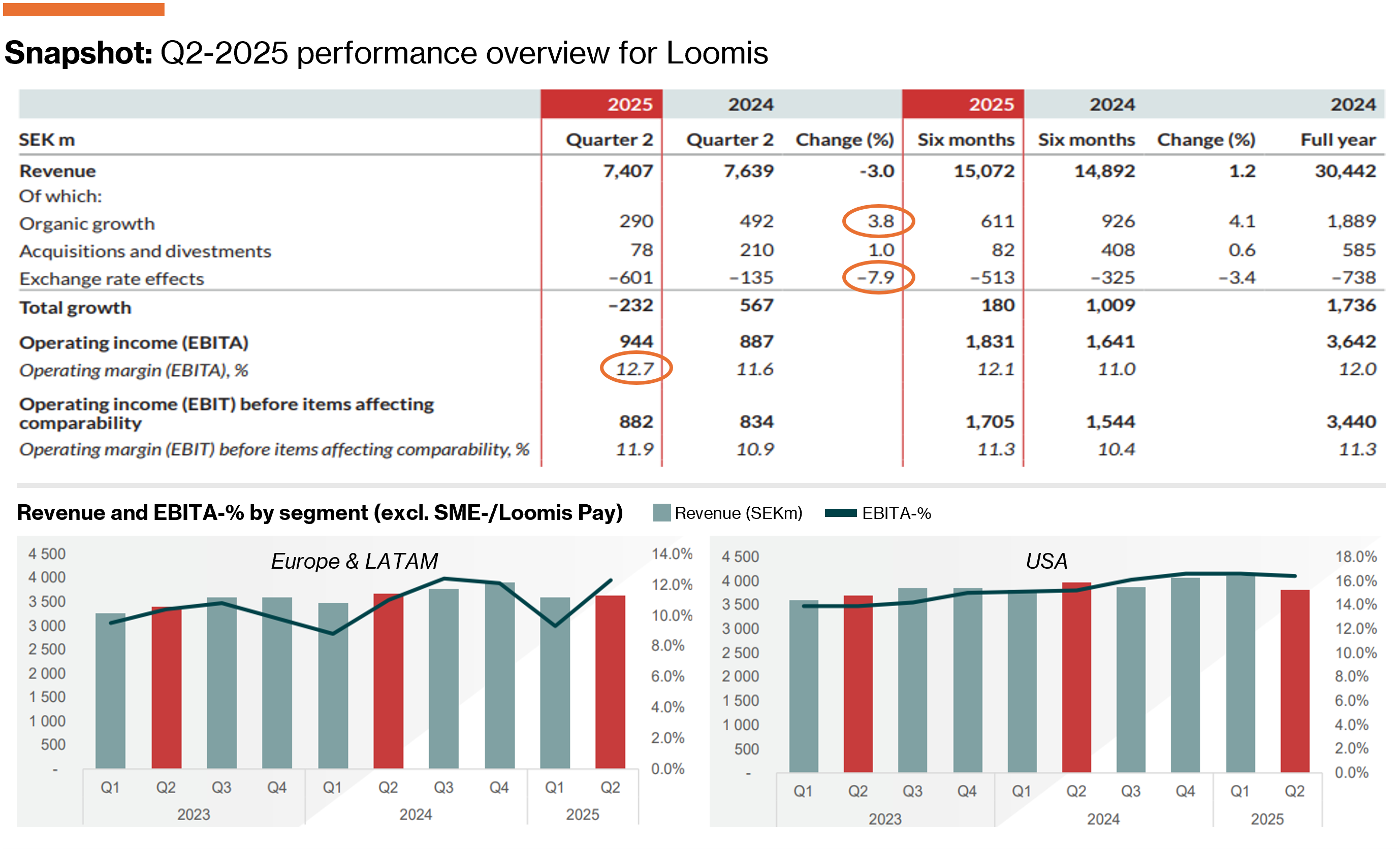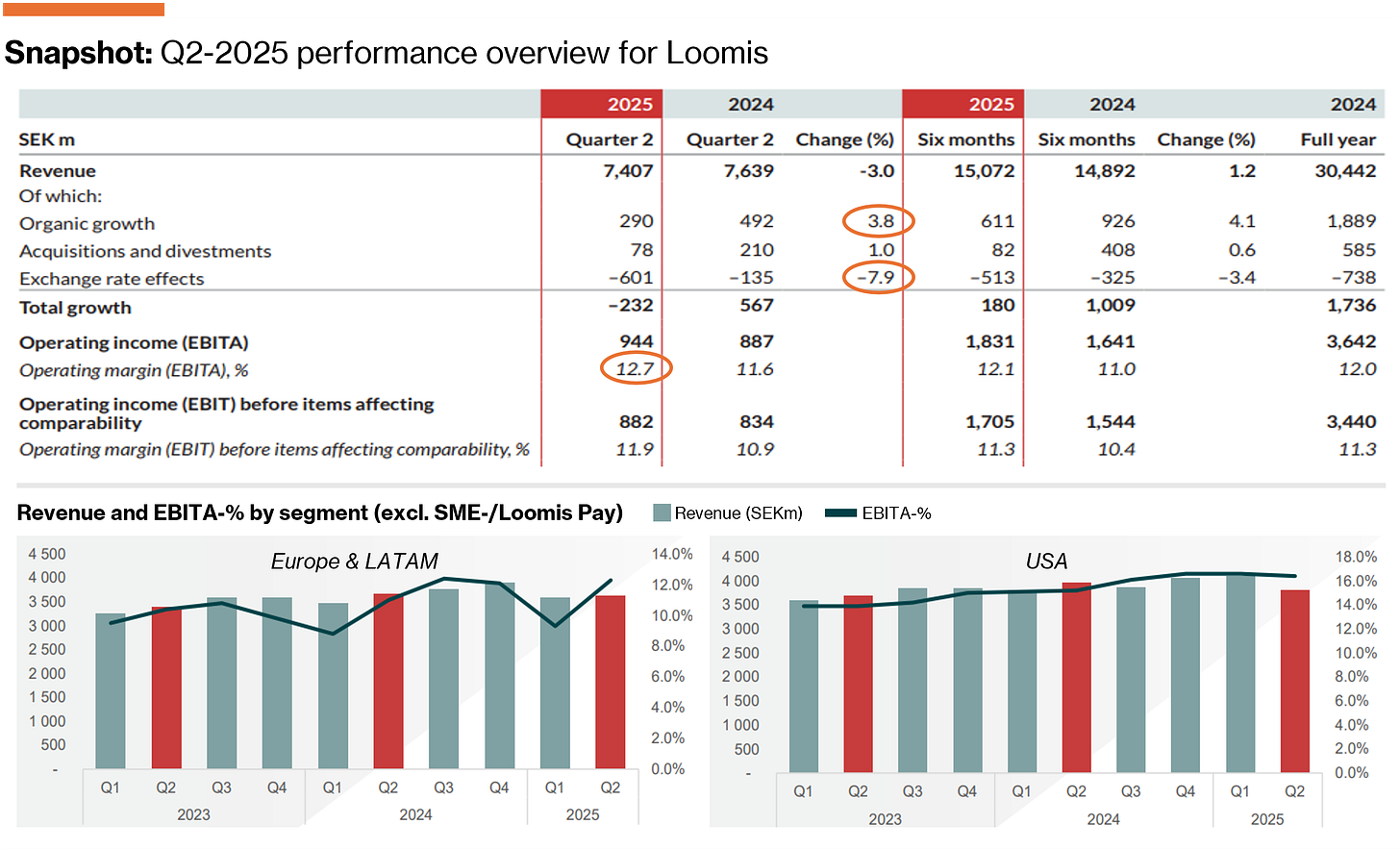 Loomis delivered a solid Q2-2025 with sales at SEK 7,407m (cons. 7,418), down -3.0% YoY, weighed by FX-headwinds (-7.9% YoY) partially cushioned by strong organic growth (+3.8%) and M&A (+1.0%). While acknowledging the FX headwind, it is worth noting that revenues landed at an all-time high on a constant currency basis; something I place more value on from a longer-term valuation standpoint.