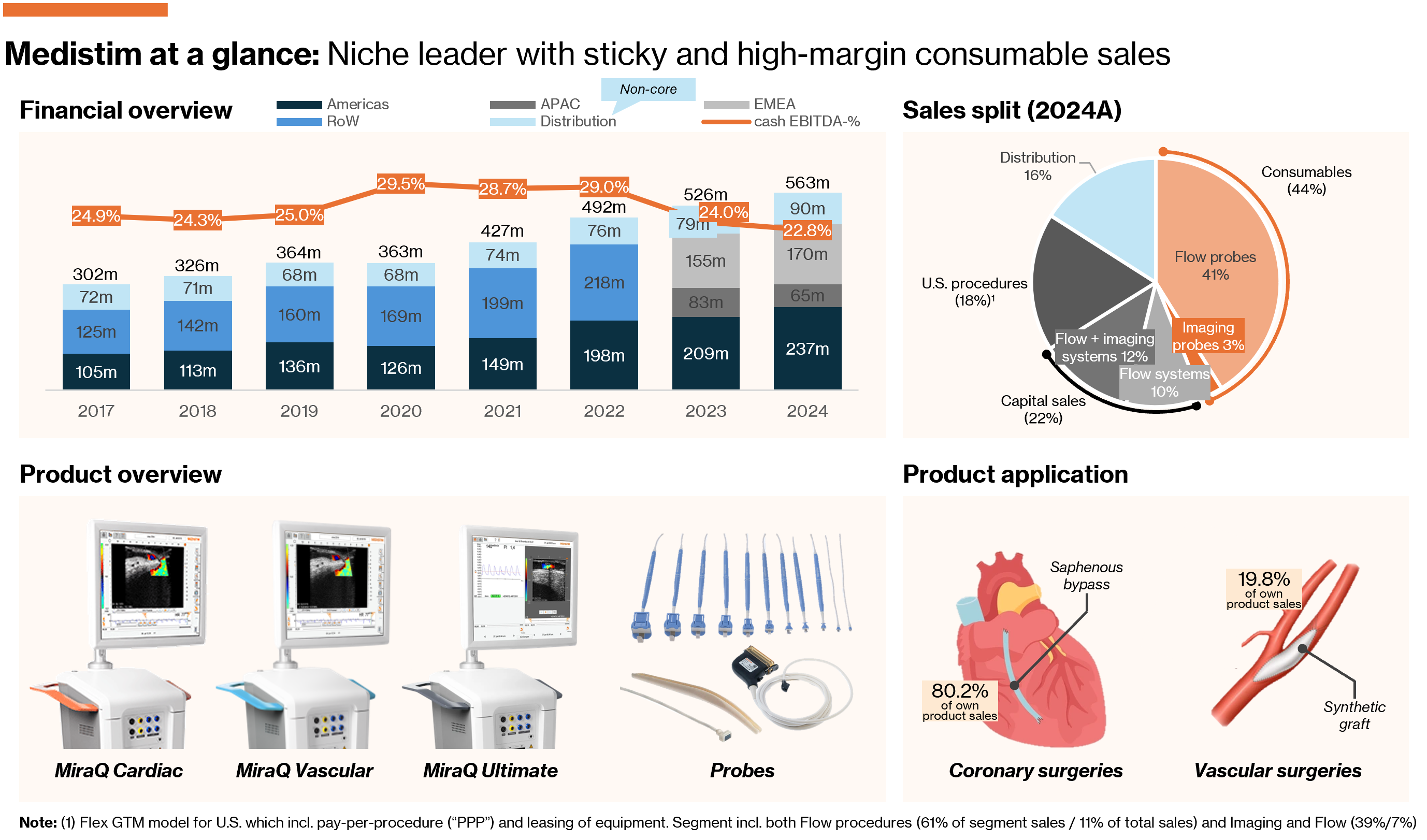 Founded in 1984 as a distributor of surgical products in Norway, Medistim has evolved into a niche quasi-monopoly within intraoperative blood flow measurement and imaging. Its products are used for coronary surgeries (e.g. coronary bypass.) and vascular surgeries (e.g. peripheral bypass), and effectively allows the surgeon to ensure there is adequate blood flow in the grafted artery — real time — before closing the patient1.