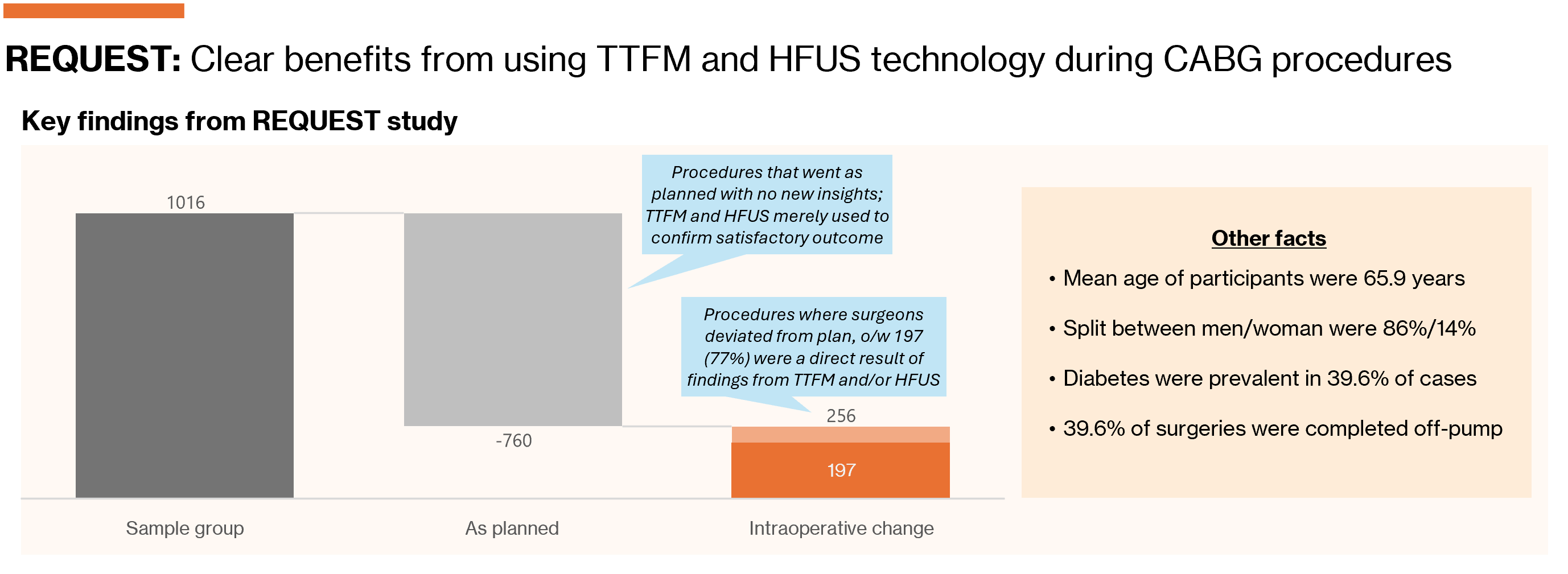 REQUEST: In 2020, Medistim5 published the results of its REQUEST study, which evidenced the clinical utility of its technology in improving outcomes during CABG procedures. The study found that in 25.2% of CABG surgeries, the surgeon made intraoperative changes to the planned procedure. Crucially, 77% of these changes were directly attributable to insights from Medistim’s TTFM and/or HFUS technologies, while the remaining 12.5% and 10.5% stemmed from manual assessments and undisclosed reasons, respectively.
