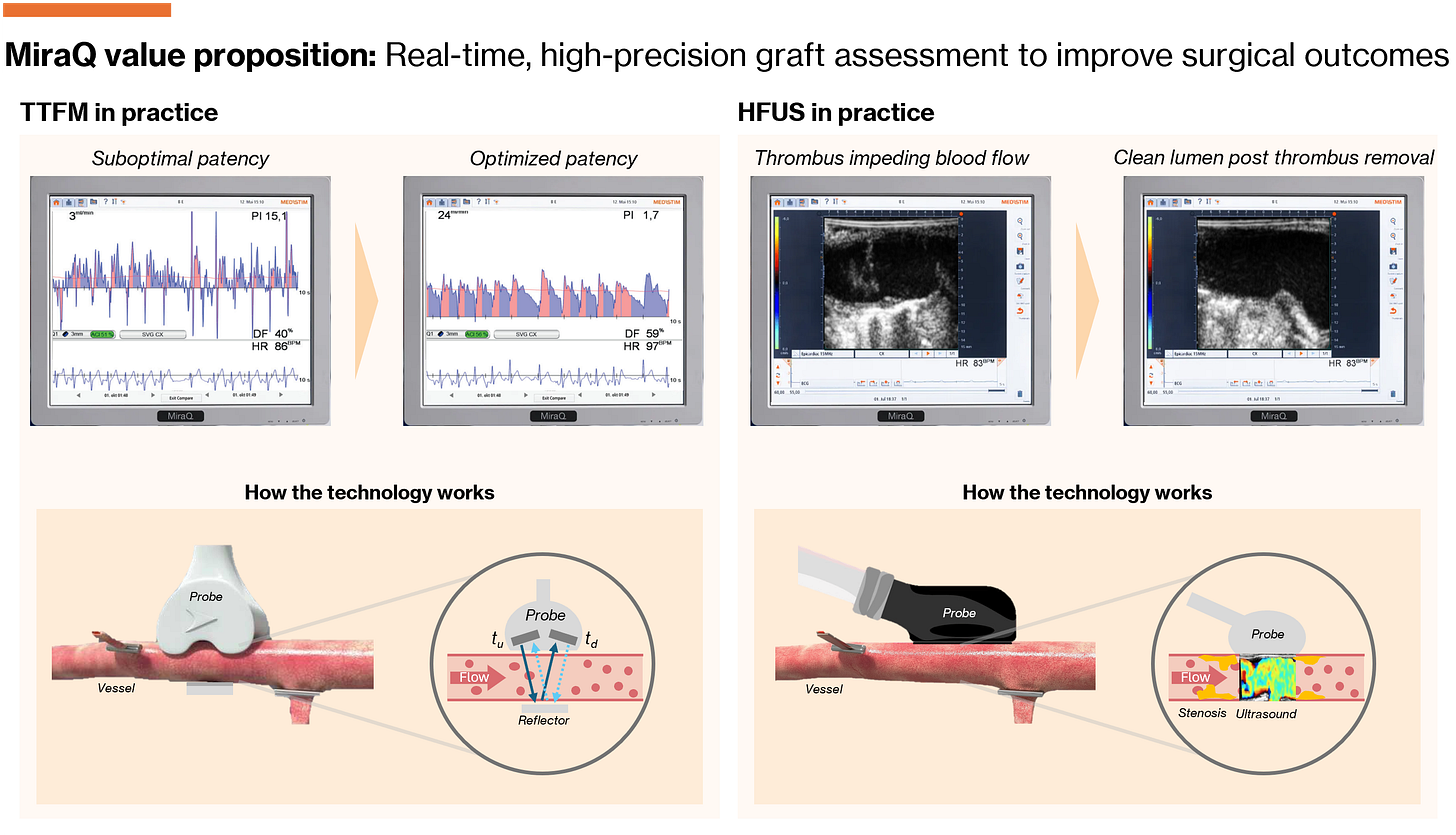 MiraQ is Medistim’s flagship platform4; a surgical guidance system combining intraoperative blood flow and imaging technologies. It provides real-time, quantitative feedback on blood flow in grafted vessels and visualizes anatomical structures during high-stakes procedures like coronary artery bypass grafting (CABG) and vascular surgery. Hence, the core value proposition lies in reducing the risk of post-operative complications, re-intervention, and mortality.
