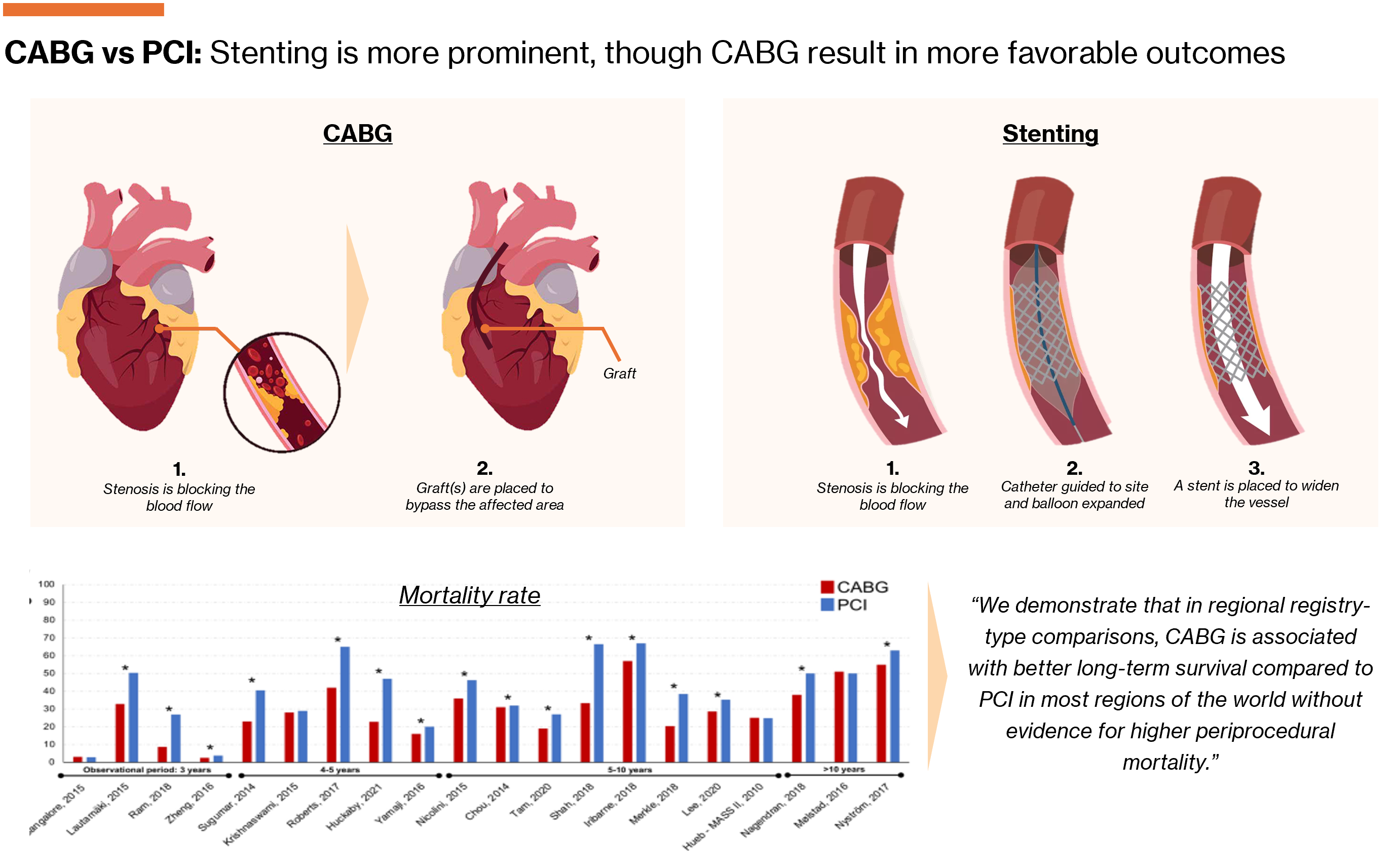 Stenting is by far the most preferred treatment for cardiac artery disease (CAD), yet some experts propose we have entered a phase of “over-stenting”6, whereby patients have several stents located in the same artery for various reasons7. Apart from the practical benefits of stenting (i.e. non-invasive, quick), the pro-stenting bias may also be attributable to cardiologists “gatekeeping” patients from CABG procedures. This is because cardiologists are typically the first ones to evaluate the patient and can immediately fix the issue with a stent — only when the blood flow is deemed too poor, which in itself is a subjective assessment by the cardiologist, will the patient be referred to a surgeon.