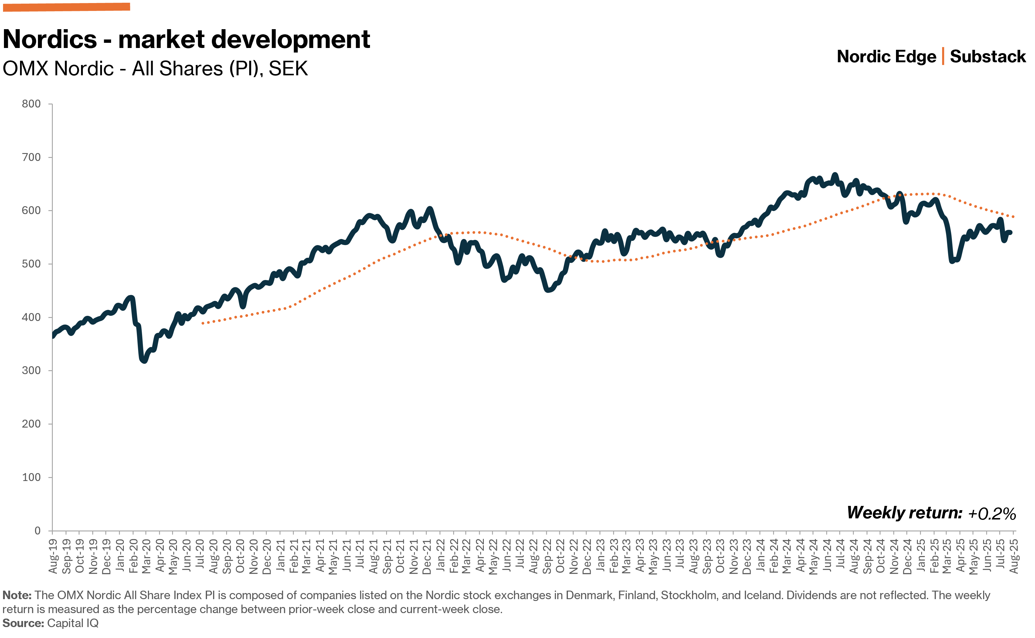 Global equities ended week 33 broadly rangebound as investors digested a busy flow of U.S. data and central bank rhetoric ahead of the Jackson Hole FED meeting (Aug. 21-23). In the Nordics, focus was affixed on the large slate of earnings, especially out of Denmark. On balance, earnings surprised to the downside yet bright spots elsewhere cushioned the blow, with the all-share index ending the week largely flat (+0.2%).