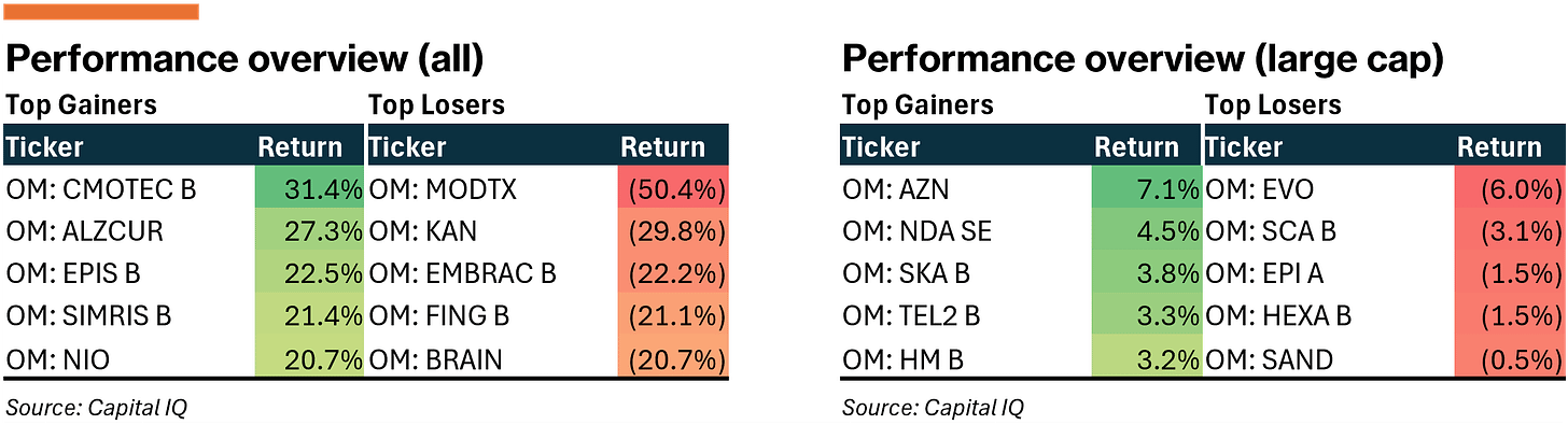 Sentiment in Stockholm leaned slightly more positive with the all-share (+0.8%) and large-cap indices ending in green territory (+1.8%). With most of large-caps already having released earnings, focus turned toward the mid-/small cap names.
