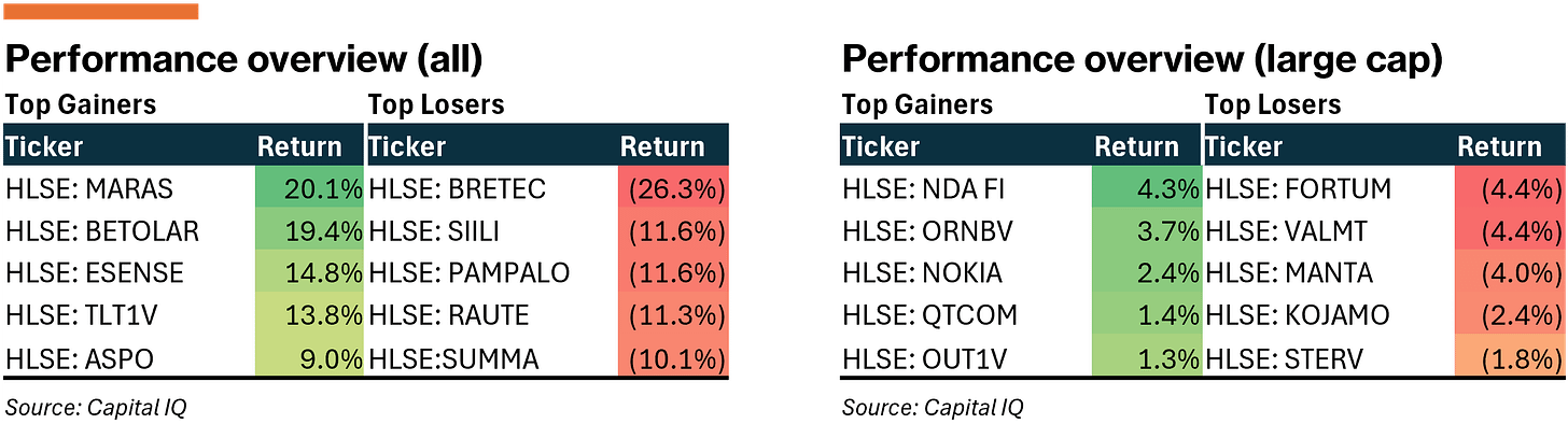 Aside from a few notable earnings which were mainly non-events, news flow was relatively muted in Finland with the all-share (+0.3%) and large-cap (+0.2%) both hovering around flat for the week.